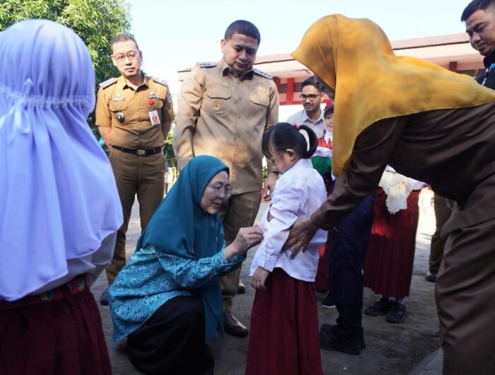 Ketua TP PKK Kota Makassar, Melinda Aksa, turut mendampingi Wali Kota Makassar, Munafri Arifuddin, dalam penyerahan perdana seragam sekolah gratis bagi siswa baru tingkat SD dan SMP pada Senin, 21 Juli 2025.