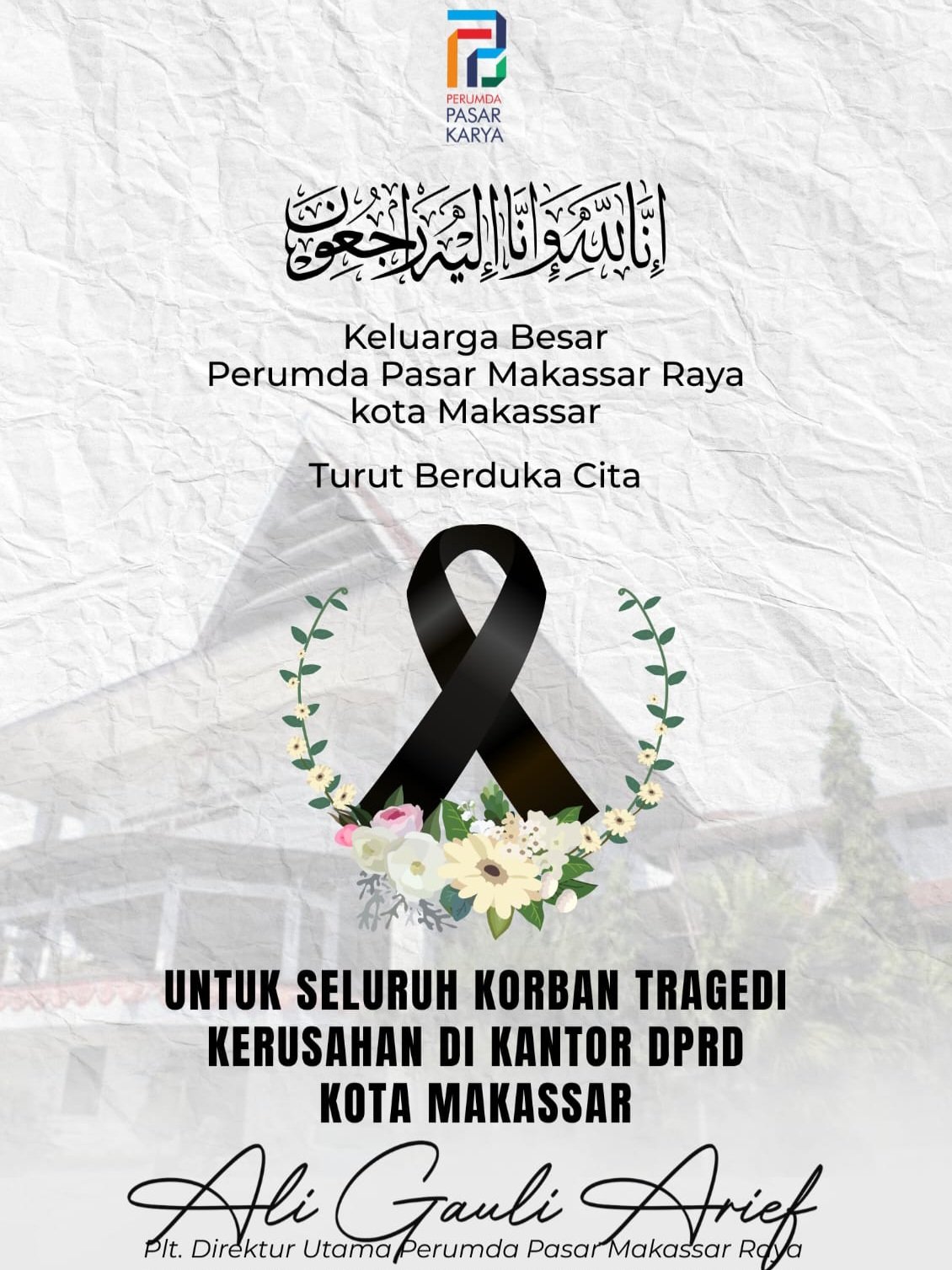 MENITNEWS.COM, MAKASSAR — Perusahaan Umum Daerah (Perumda) Pasar Makassar Raya, menyampaikan belasungkawa dan duka cita yang mendalam atas tragedi kerusuhan yang terjadi di Kantor Dewan Perwakilan Rakyat Daerah (DPRD) Kota Makassar.