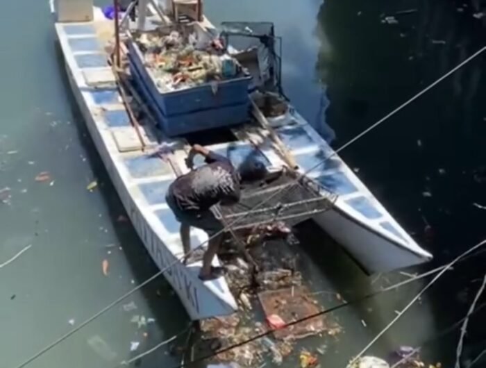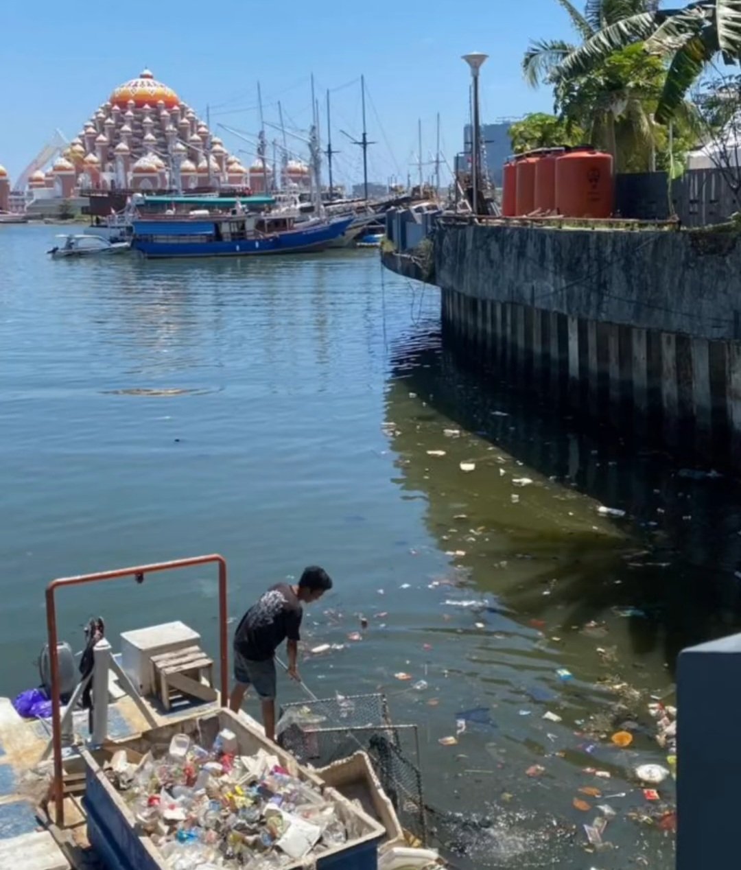 Video berdurasi 37 detik itu, memperlihatkan sebuah kapal katamaran sederhana yang menjadi panggung utama perjuangan. Di atasnya, seorang petugas kebersihan dengan cekatan menggunakan jaring dan alat pemungut sampah untuk mengangkat berbagai jenis limbah, mulai dari botol plastik, kantong kresek, hingga kemasan makanan.