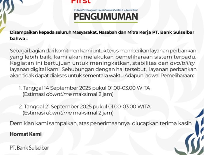 MENITNEWS.COM, MAKASSAR — PT. Bank Pembangunan Daerah Sulawesi Selatan dan Sulawesi Barat (Bank Sulselbar), akan melakukan pemeliharaan sistem terpadu untuk meningkatkan layanan perbankan.