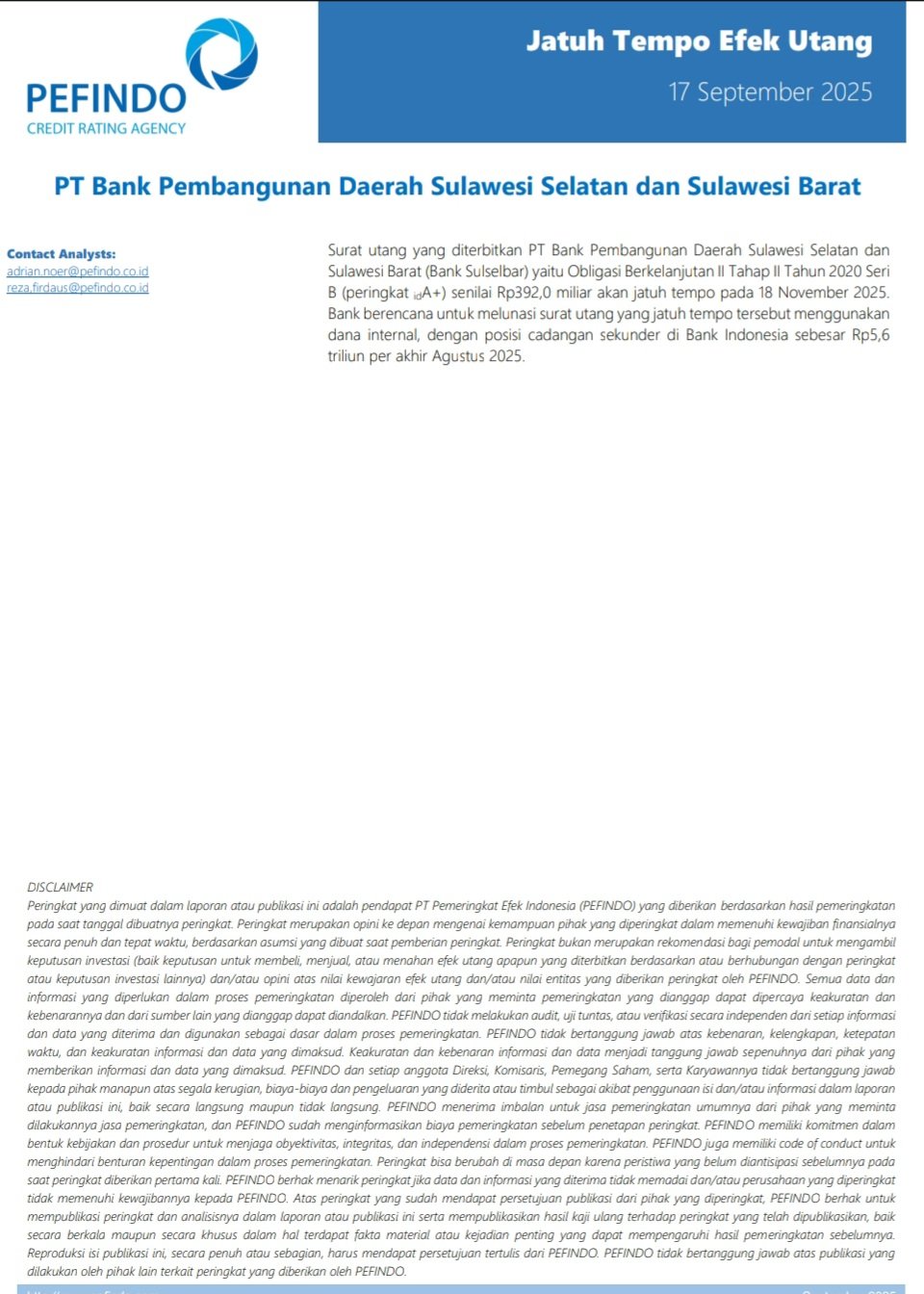 Obligasi ini telah memperoleh peringkat idA+ (Single A Plus) dari PT Pemeringkat Efek Indonesia (PEFINDO), yang mencerminkan keyakinan lembaga pemeringkat terhadap kemampuan Bank Sulselbar memenuhi kewajiban finansial secara penuh dan tepat waktu.