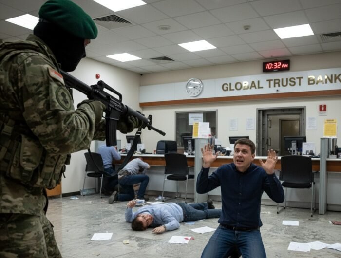 Menurut informasi, pelaku datang mengenakan jaket dan membawa senjata laras panjang. Saat ditanya petugas keamanan mengenai maksud kedatangannya, ia mengaku ingin bertemu dengan Manajer Bank. Tak lama kemudian, pelaku diduga menodongkan senjata dan sempat melepaskan tembakan.