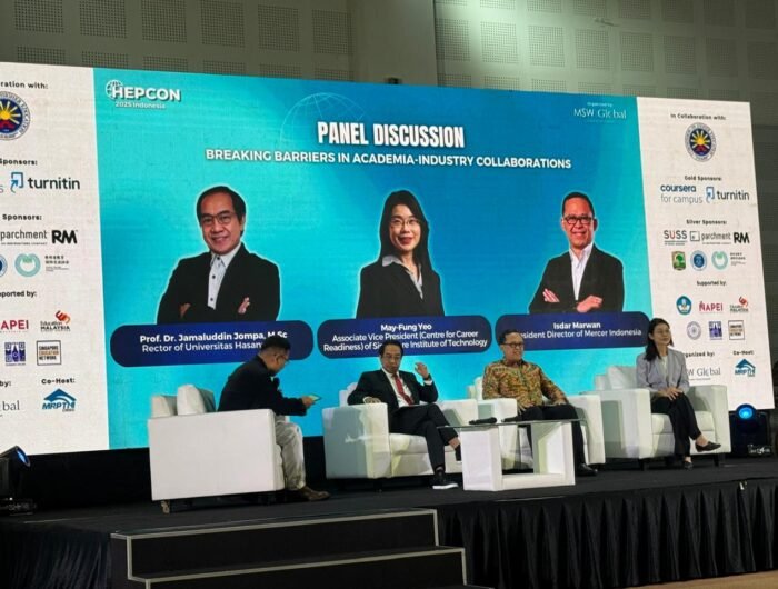 Dalam Second Panel Discussion bertema “Breaking Barriers in Academia–Industry Collaborations”, Rektor Unhas Prof. JJ, hadir bersama May-Fung Yeo (Associate Vice President, Centre for Career Readiness, Singapore Institute of Technology) serta Isdar Marwan (President Director, Mercer Indonesia).