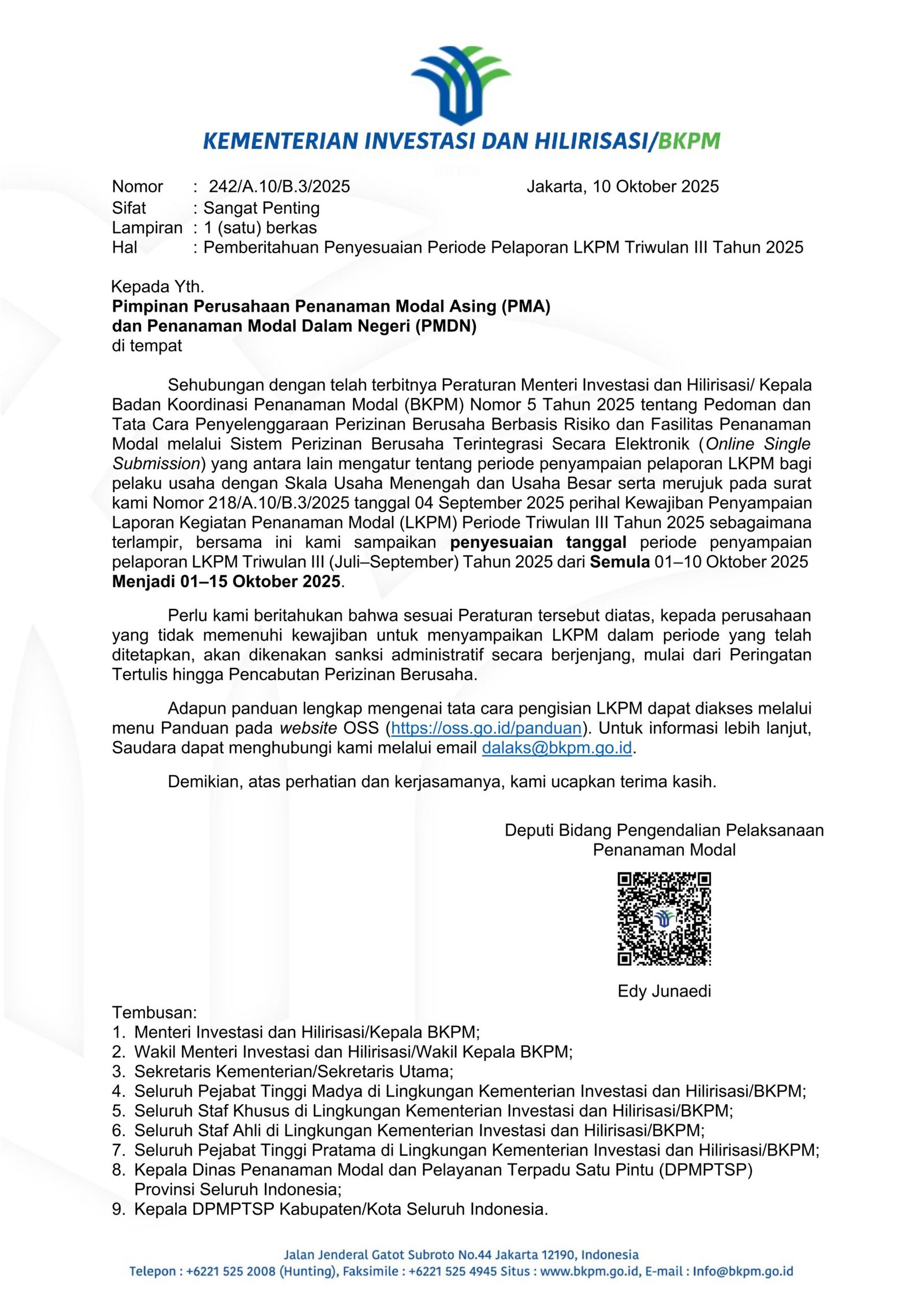 Semula, batas waktu pelaporan LKPM Triwulan III adalah 1-10 Oktober 2025. Dengan adanya perpanjangan ini, Pelaku Usaha memiliki waktu tambahan untuk memastikan laporan mereka akurat dan terkirim tepat waktu.