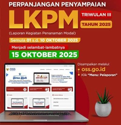 Batas waktu penyampaian Laporan Kegiatan Penanaman Modal (LKPM) Triwulan III Tahun 2025 (Periode Juli–September) secara resmi diperpanjang hingga hari ini Rabu, 15 Oktober 2025.