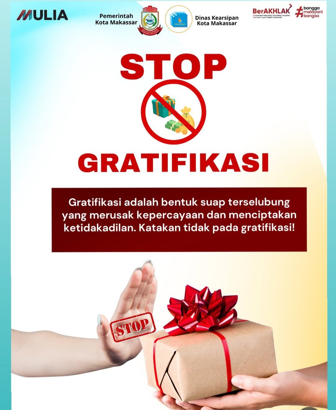 Dalam poster yang diunggah, Dinas Kearsipan Makassar dengan tegas menyerukan “STOP GRATIFIKASI!”, mengingatkan bahwa gratifikasi adalah “bentuk suap terselubung yang merusak kepercayaan dan menciptakan ketidakadilan.” Pesan utama yang disampaikan adalah ajakan untuk “Katakan tidak pada gratifikasi!”