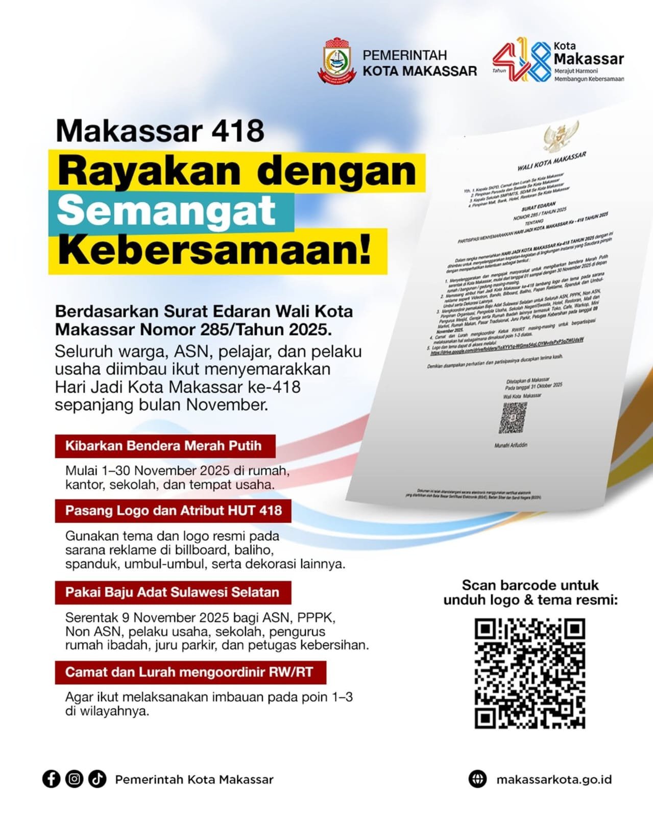 MENITNEWS.COM, MAKASSAR — Peringatan Hari Ulang Tahun ke-418 Kota Makassar, yang puncak acaranya digelar Minggu, 9 November 2025 mendatang, menjadi momentum reflektif bagi pemerintah kota untuk semakin mendekatkan diri kepada masyarakat.