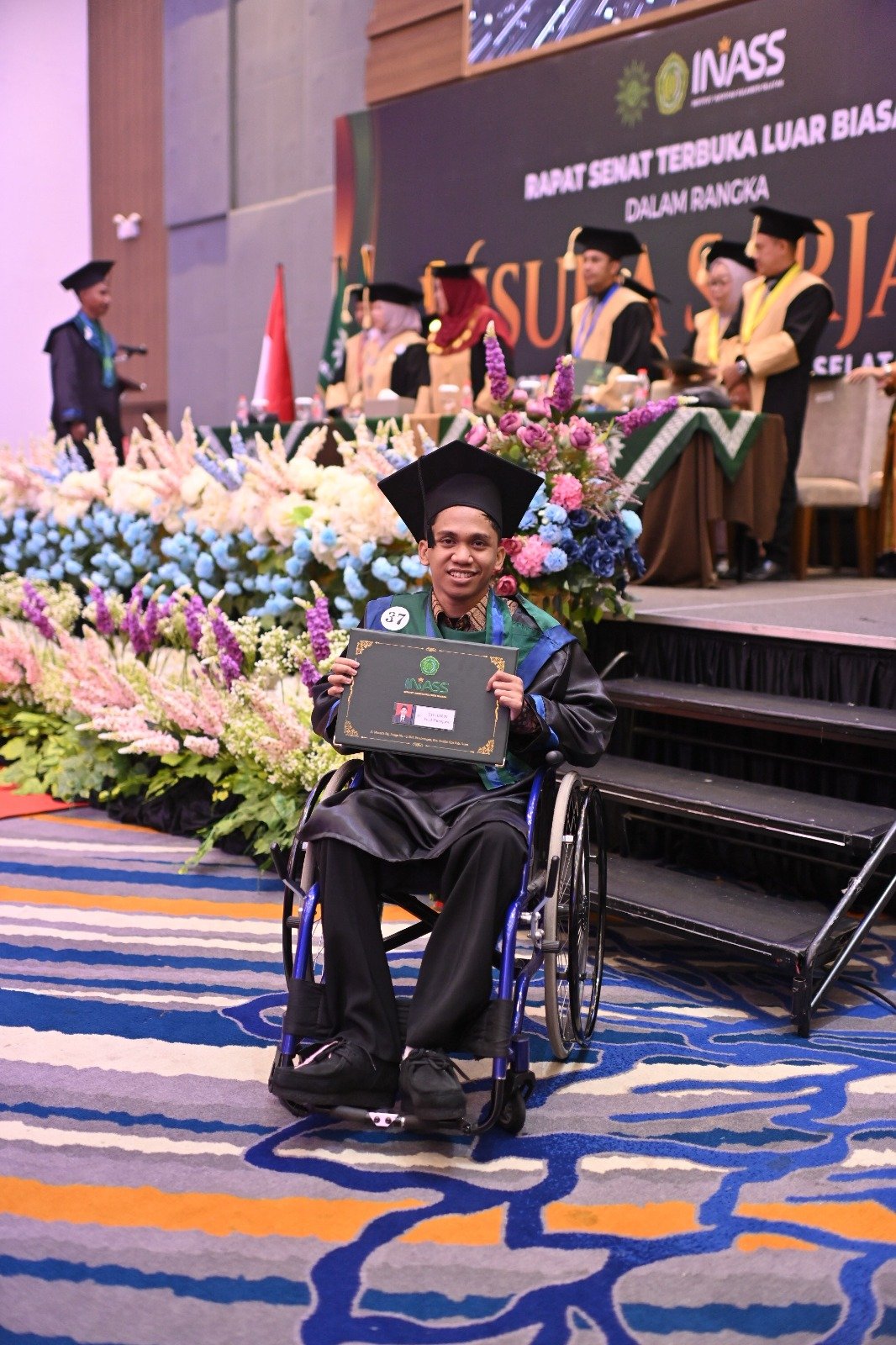 Ketika nama Fuad dipanggil, beberapa teman seangkatan secara spontan membantunya mendorong kursi roda menuju podium utama. Rektor INASS, Nurhayati Azis, SE., M.Si, menyambut Fuad dengan hangat dan penuh penghormatan begitu ia tiba.