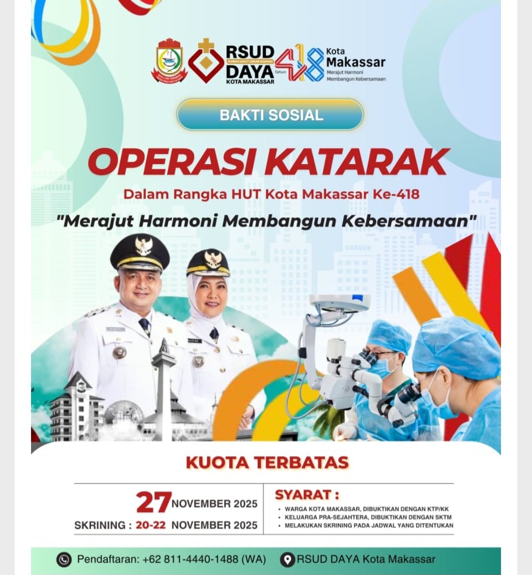 MENITNEWS.COM, MAKASSAR — Rumah Sakit Umum Daerah (RSUD) Daya Kota Makassar, menggelar skrining atau pemeriksaan awal operasi katarak yang akan dilaksanakan pada Kamis, 27 November 2025 mendatang. Kegiatan ini masih dalam rangka HUT Kota Makassar yang ke-418 tahun.