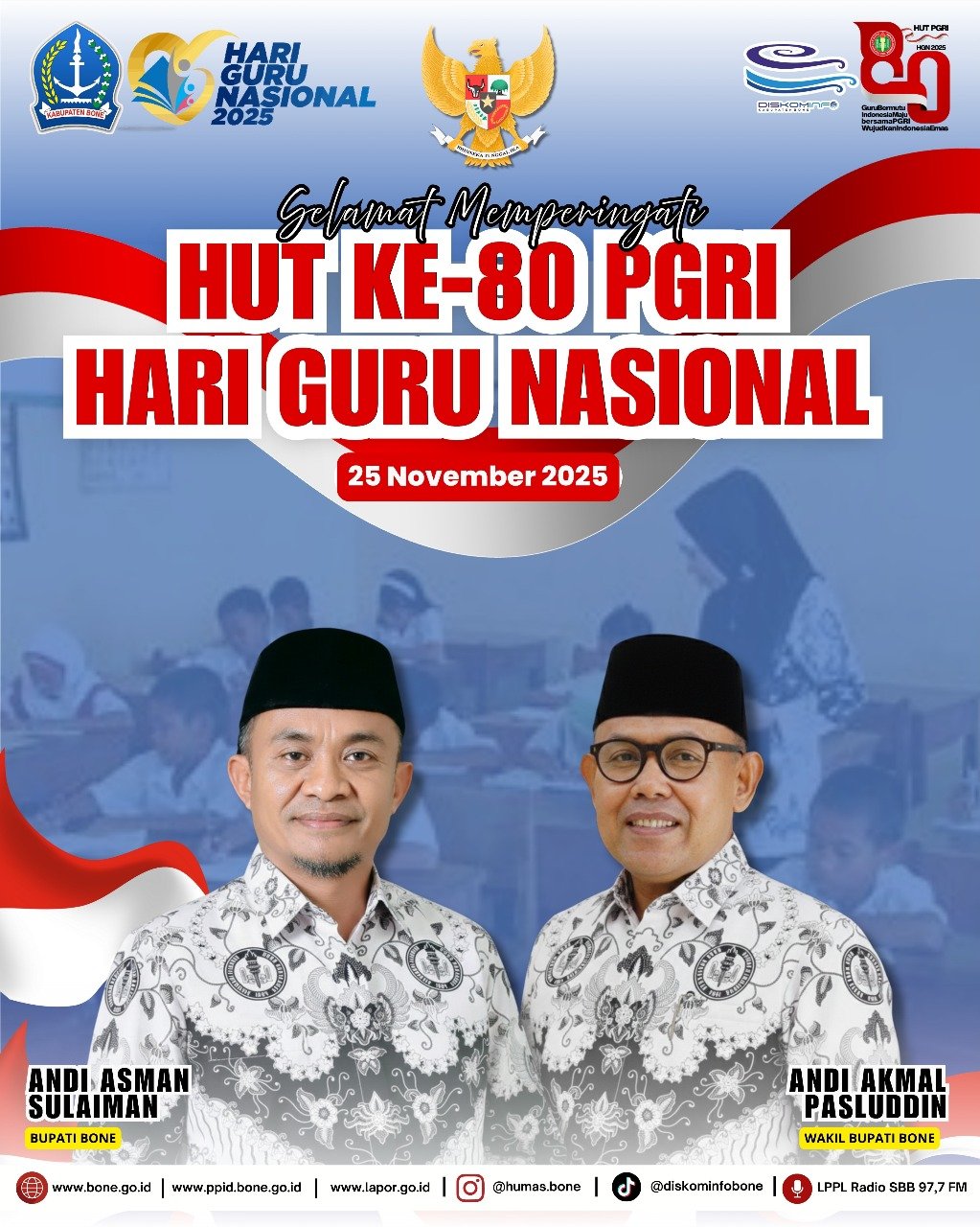 “Selamat Hari Ulang Tahun ke-80 PGRI dan Hari Guru Nasional Tahun 2025. Guru adalah tonggak utama dalam membangun kualitas sumber daya manusia di Bone,” ujar Bupati Andi Asman.