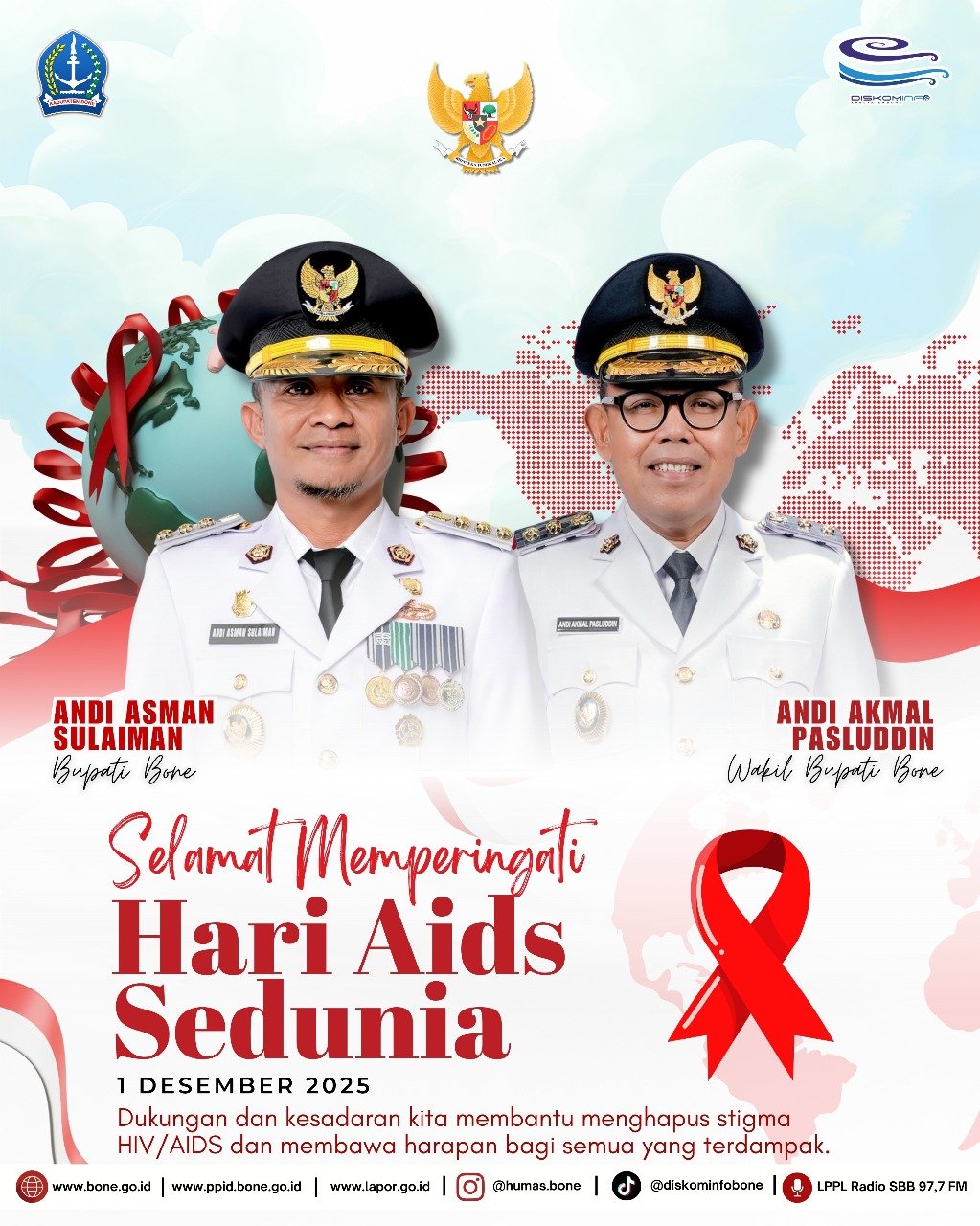 Melalui unggahan resmi yang menampilkan poster bersama Wakil Bupati Bone, Andi Asman Sulaiman, Bupati Bone, menyampaikan ucapan “Selamat Memperingati Hari AIDS Sedunia” kepada seluruh masyarakat.