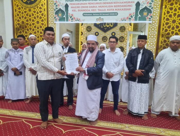 MENITNEWS.COM, MAKASSAR — Semangat baru menyelimuti warga Beroanging, Kelurahan Suangga, Kecamatan Tallo. Pengurus Dewan Kemakmuran Masjid (DKM) Darul Mukhlisin resmi dikukuhkan untuk masa khidmat 2026-2028.