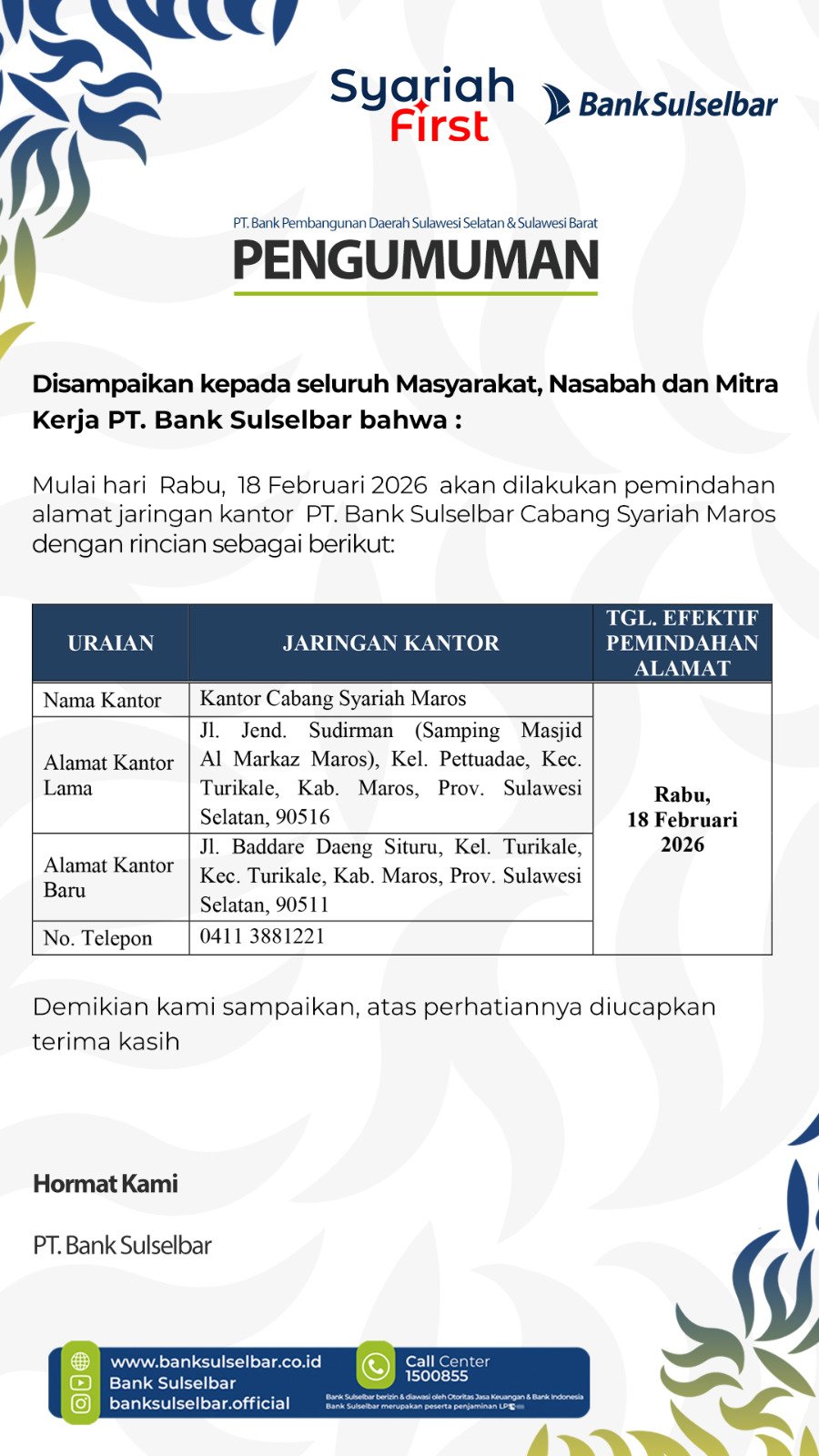 Untuk nomor telepon Bank Sulselbar tetap di 0411 3881221. Tanggal efektif operasional kantor baru adalah pada Rabu, 18 Februari 2026 mendatang.