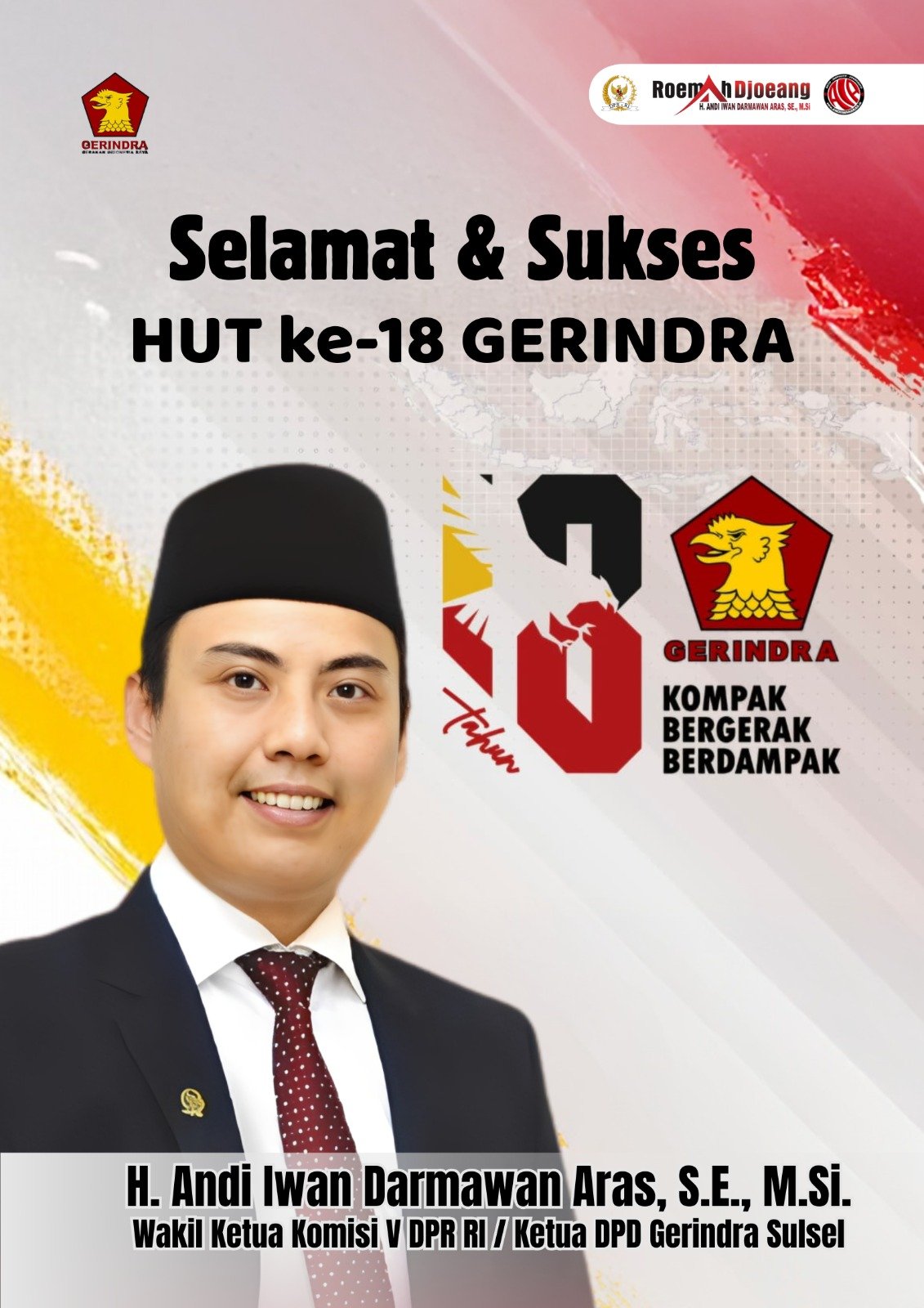 ”Selamat dan Sukses HUT ke-18 Partai Gerindra. Di usia yang semakin matang ini, kami berkomitmen untuk terus menjaga kekompakan. Bukan sekadar bergerak,” tuturnya.