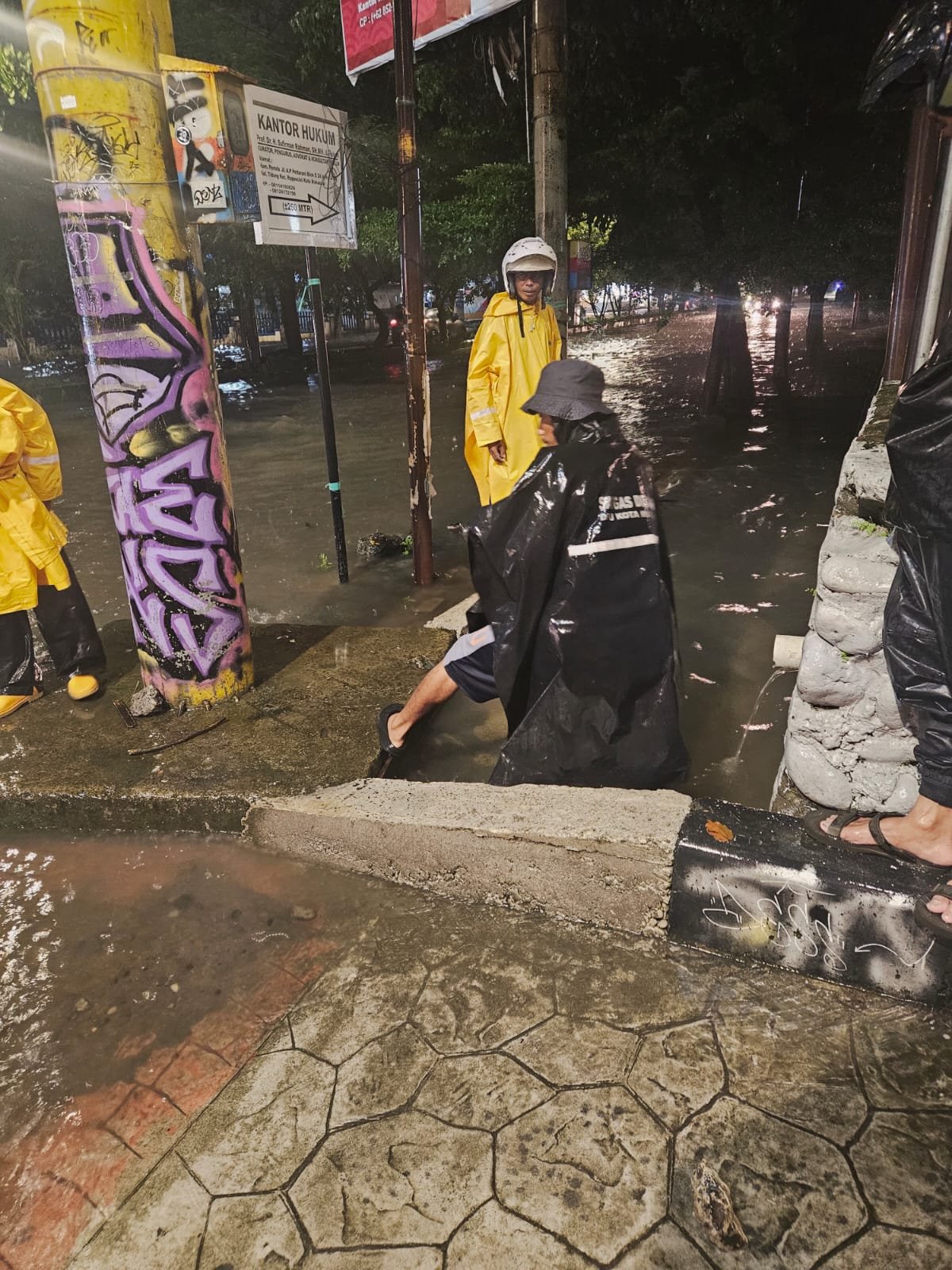 Di tengah guyuran hujan dan genangan yang masih mengalir, petugas Satgas bekerja membersihkan saluran drainase dari tumpukan sampah dan sedimen yang menyumbat aliran air.