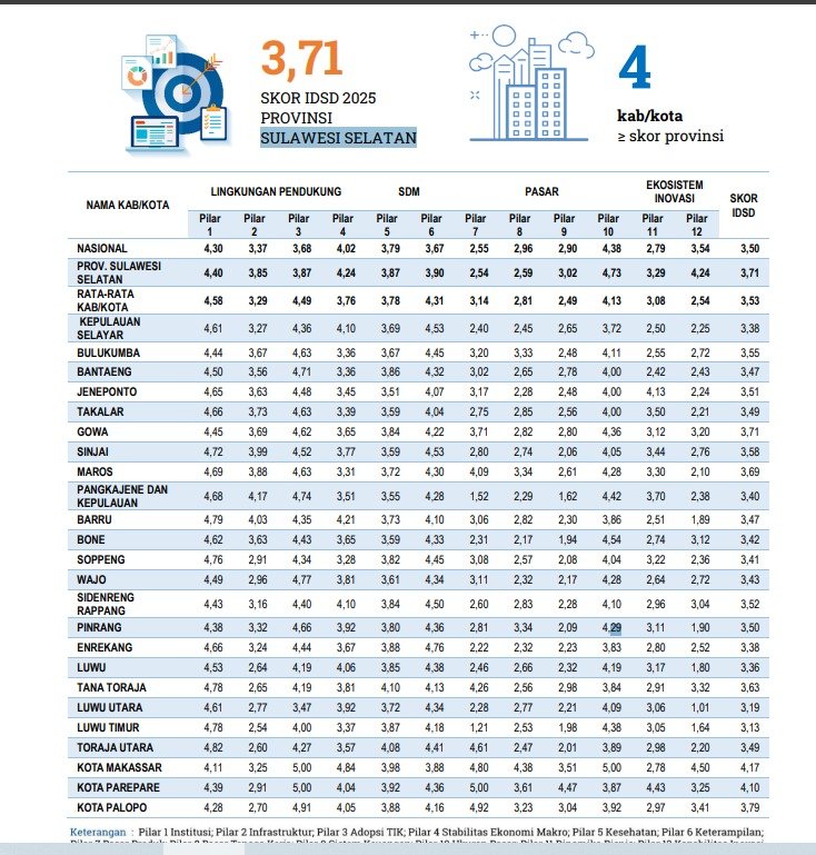 Dalam hasil IDSD 2025, Kota Makassar mencatatkan skor 4,17. Angka ini menempatkan Makassar di atas rata-rata nasional yang berada pada skor 3,50. Bahkan, capaian tersebut juga melampaui skor Provinsi Sulawesi Selatan yang berada di angka 3,71.