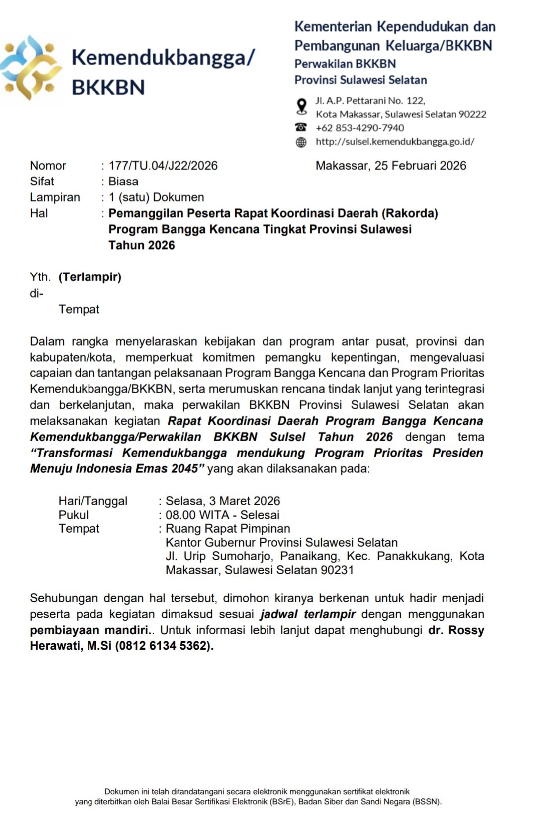 Bagi masyarakat atau pihak terkait yang membutuhkan informasi lebih lanjut mengenai pelaksanaan kegiatan ini, dapat menghubungi narahubung dari Kemendukbangga/BKKBN Sulsel melalui kontak resmi yang telah disediakan. (*)