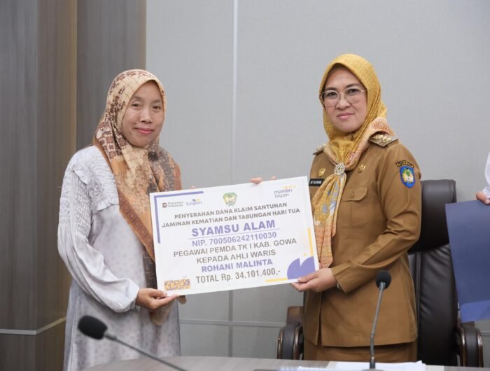 MENITNEWS.COM, GOWA — Bupati Gowa, Sitti Husniah Talenrang atas nama Pemkab Gowa, menyerahkan santunan jaminan kematian dari PT Taspen Persero kepada ahli waris almarhum Syamsu Alam, PPPK Guru SD Bangkeng Batu, Kecamatan Tombolopao di Ruang Rapat Bupati Gowa, Kantor Bupati Gowa, Senin (2/3/2026).