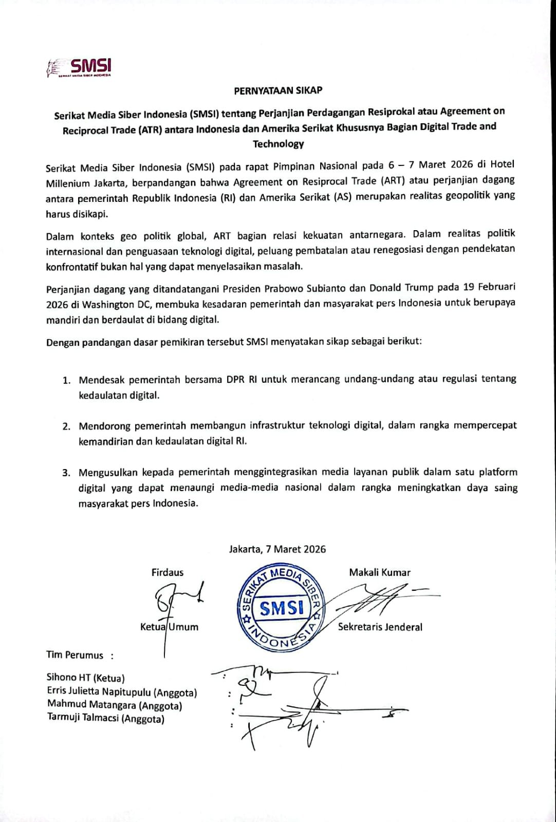Dalam dokumen resmi yang ditandatangani Ketua Umum SMSI, Firdaus, dan Sekretaris Jenderal, Makali Kumar itu, SMSI menilai perjanjian perdagangan antara Indonesia dan Amerika Serikat merupakan realitas geopolitik global yang harus disikapi secara strategis oleh pemerintah dan masyarakat, termasuk kalangan Pers Nasional.