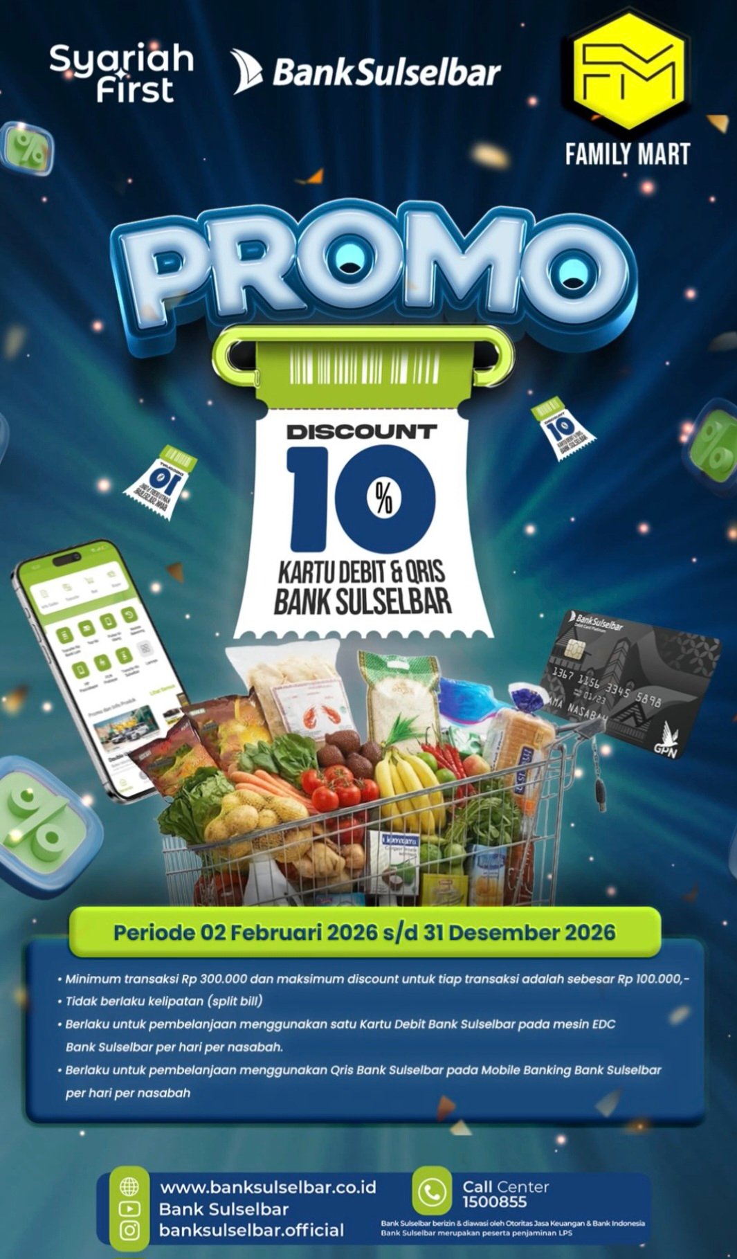 Berkolaborasi dengan jaringan ritel Family Mart, Bank Sulselbar resmi meluncurkan program promo diskon belanja sebesar 10 persen yang berlaku mulai Februari hingga akhir Desember 2026.